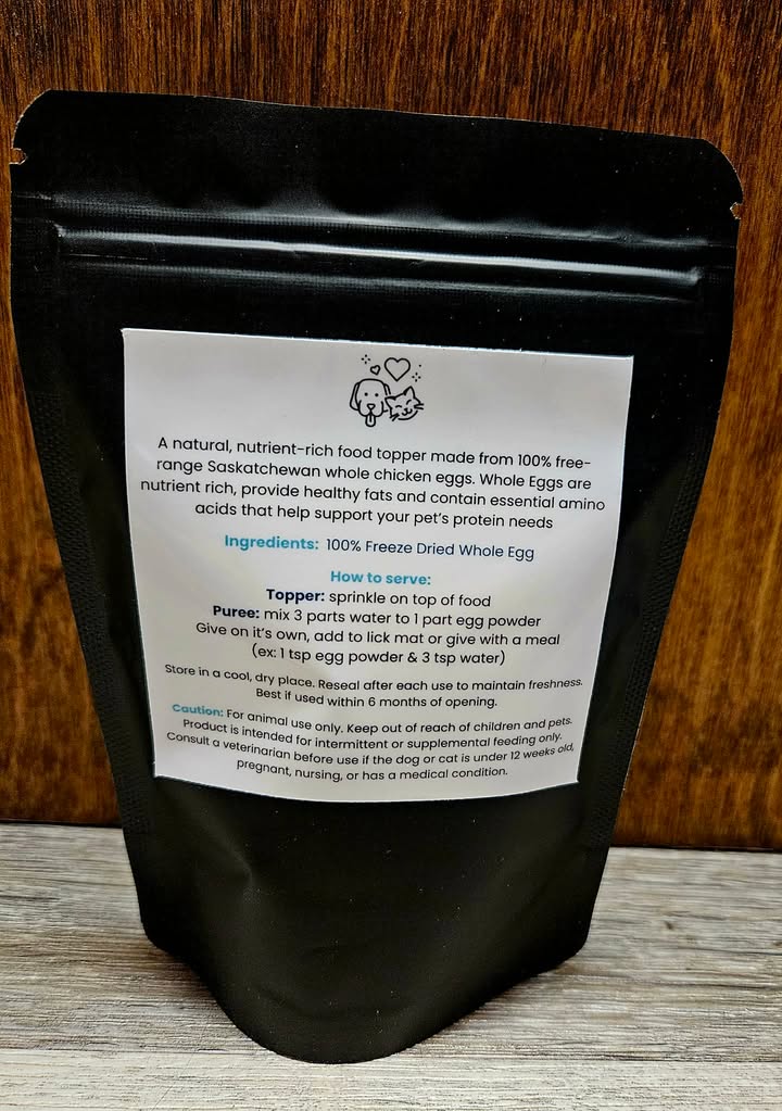 Ingredients: 100% Freeze Dried Whole Raw Chicken Eggs
